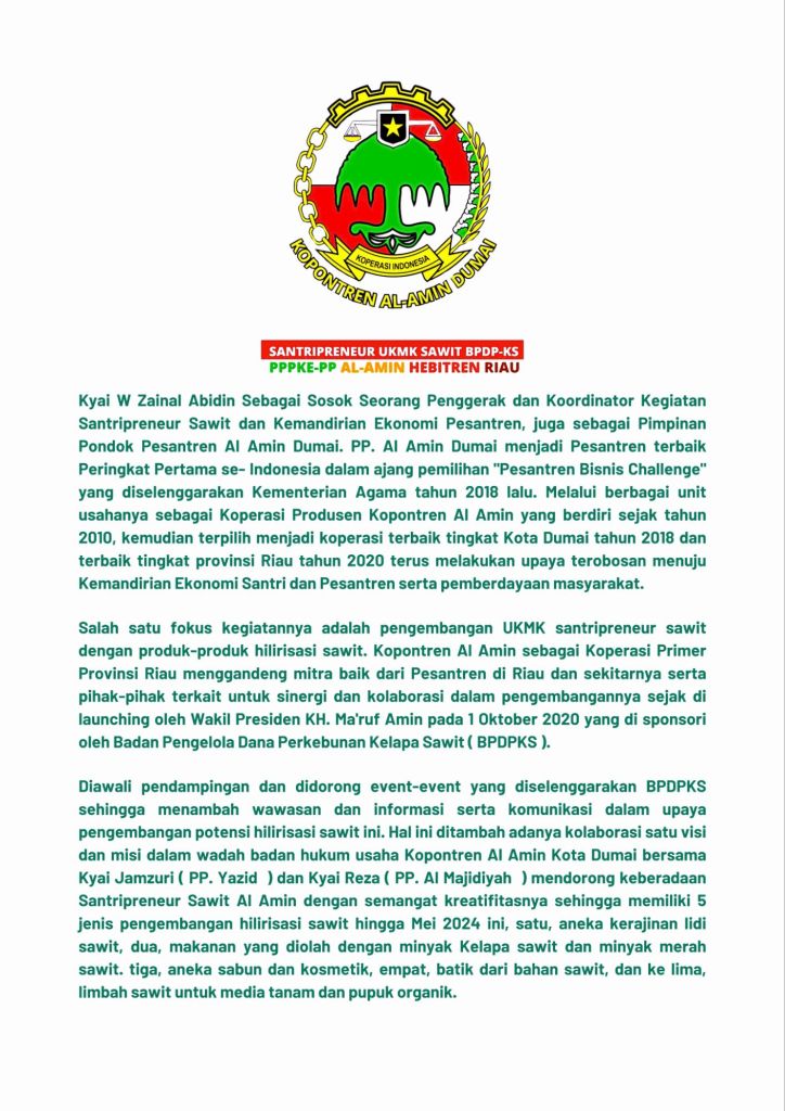 Pondok Pesantren AlAmin Dumai memiliki hamparan lahan yang cukup luas. sehingga sebagian besar masyarakatnya bermata pencaharian sebagai petani dan pekebun sayursayuran. Inilah yang menjadi daya tarik pihak pesantren untuk ikut memberikan peran melalui Kopontren Al-Amin Dumai agar masyarakat sekitar dapat ikut bersama dalam mewujudkan kesejahteraan dan kemajuan ekonomi yang dibantu dengan sentuhan teknologi. Semua kegiatan ekonomi Pondok Pesantren Al-Amin dibawah Badan Usaha Milik Pesantren dalam bentuk Koperasi Pondok Pesantren Al-Amin.