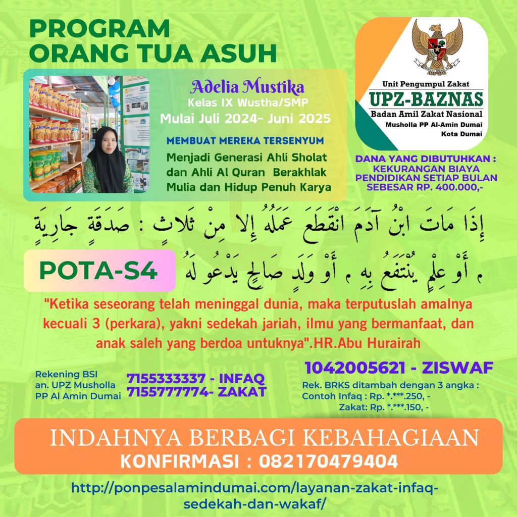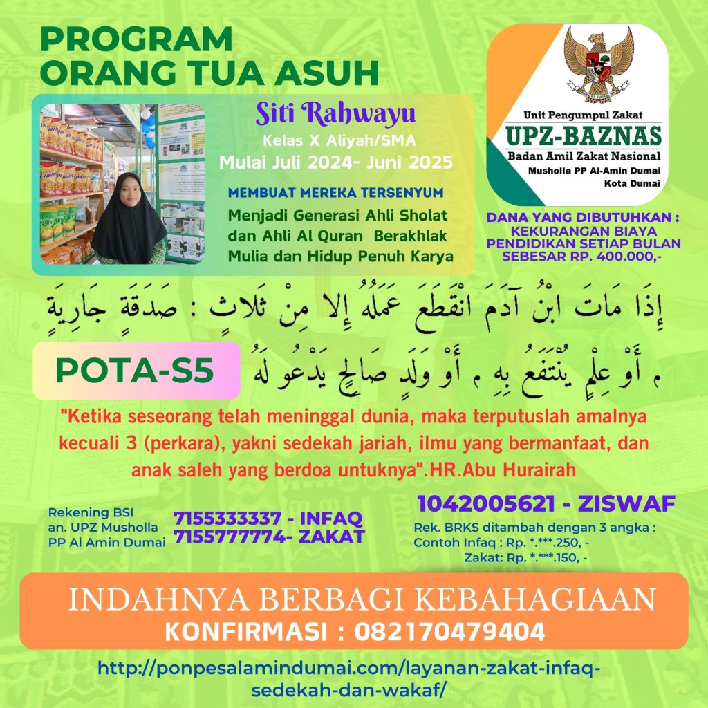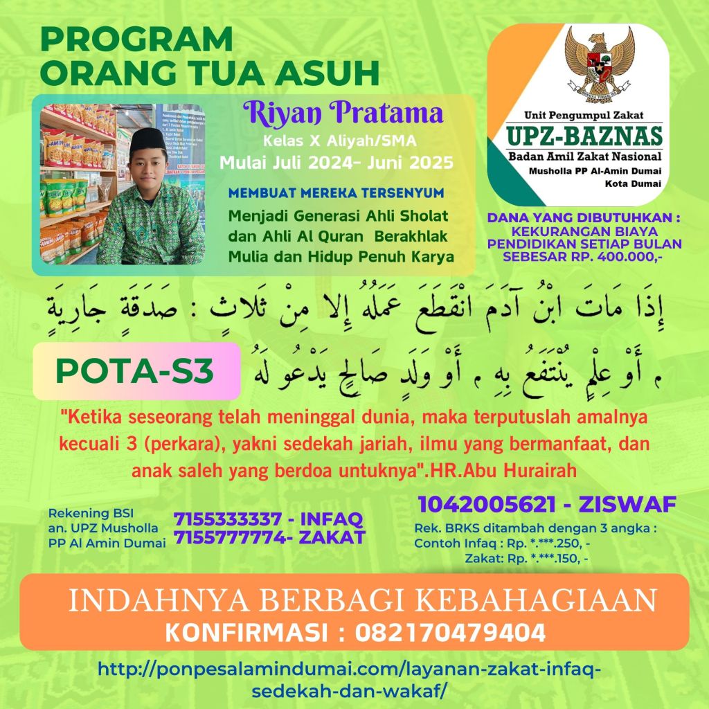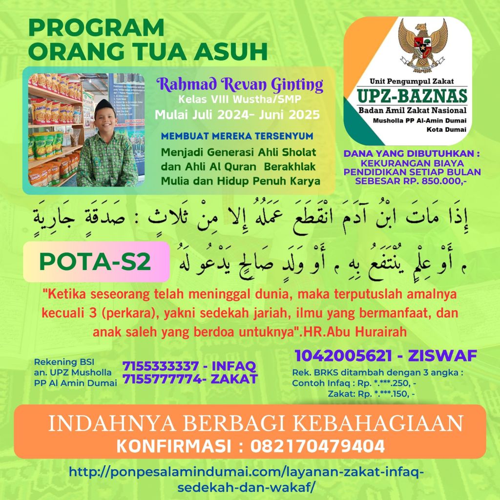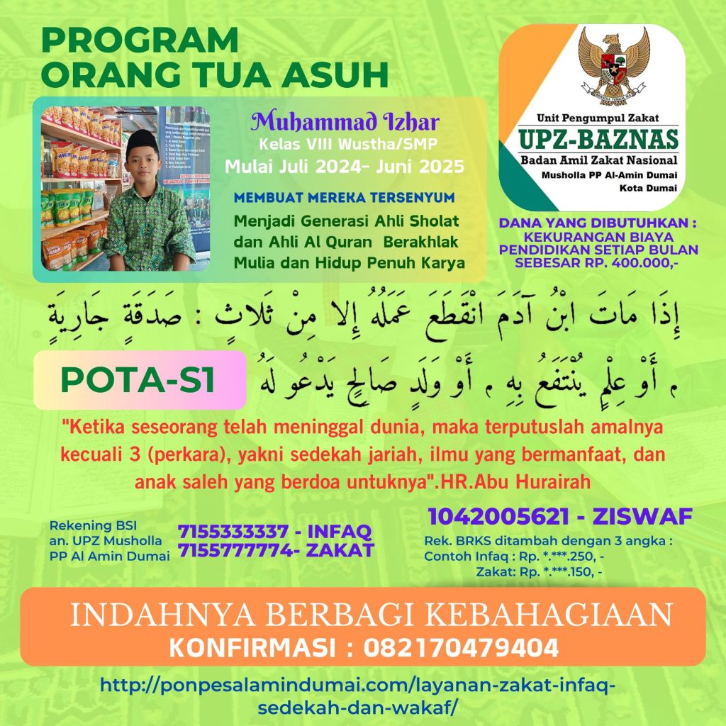 Terkhusus pada bulan Juli 2024 Pekan ke-3 Layanan ZISWAF Pondok Pesantren Al Amin Dumai fokus mencari orang tua asuh untuk 5 Santri Dhuafa yang mondok di tahun pelajaran 2024-2025