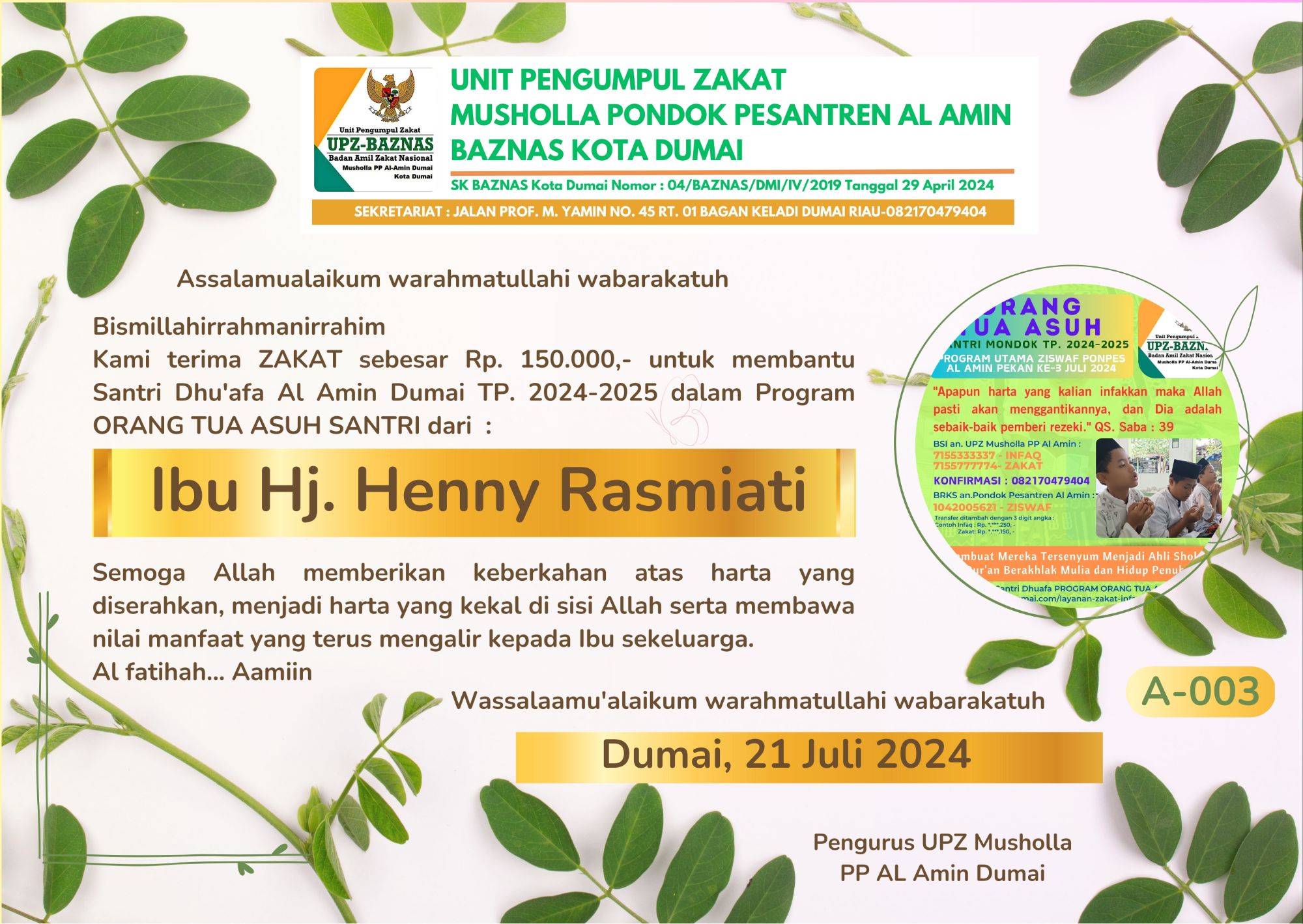 Ucapan Terima Kasih Atas Dukungan Zakat Infaq Sedekah terhadap Program Orang Tua Asuh untuk 5 Santri Dhu’afa Al Amin Dumai Tahun Pelajaran 2024-2025