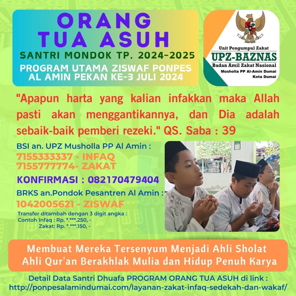 - Kegiatan penggalangan Dana Zakat Infaq dan Sedekah untuk Program Orang Tua Asuh Bagi 5 Anak Dhuafa Ponpes Al Amin Dumai untuk Tahun Pelajaran 2024-2025 ini dihimpun mulai Jum’at 19 Juli 2024 hingga Jum’at 26 Juli 2024.
