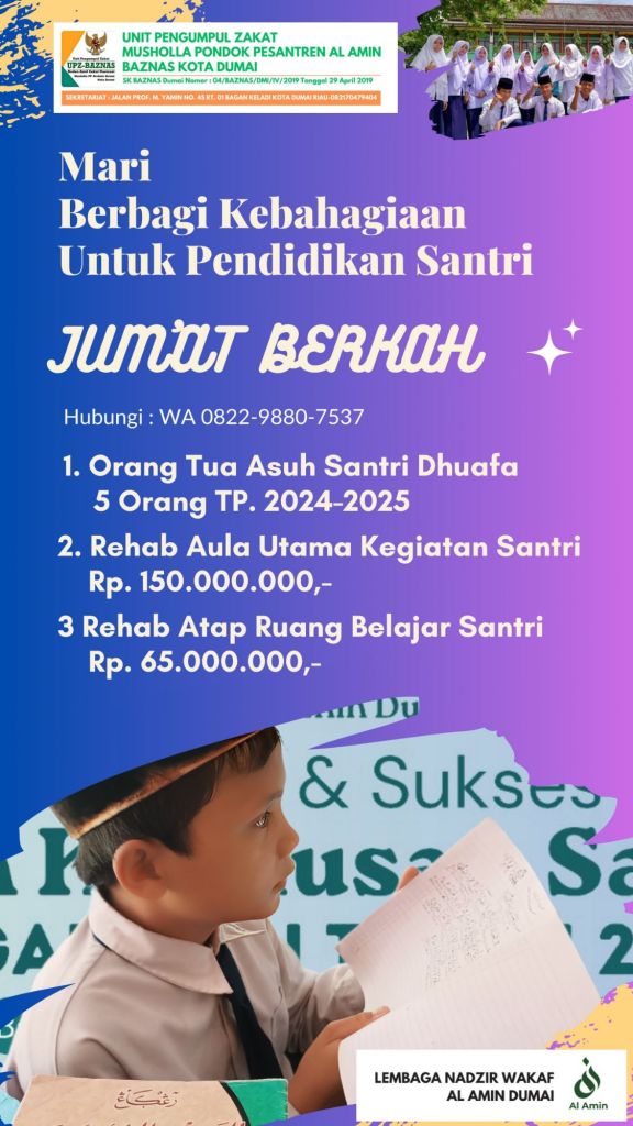 Dengan penuh rasa syukur dan kebahagiaan yang mendalam, kami dari Pengurus UPZ Musholla Pondok Pesantren Al Amin Dumai ingin mengucapkan terima kasih yang sebesar-besarnya atas kesediaan dan keikhlasan Bapak/Ibu untuk menjadi Orang Tua Asuh bagi 5 santri dhuafa Pondok Pesantren Al Amin Dumai melalui Zakat Infaq dan Sedekah Bapak/Ibu sekalian