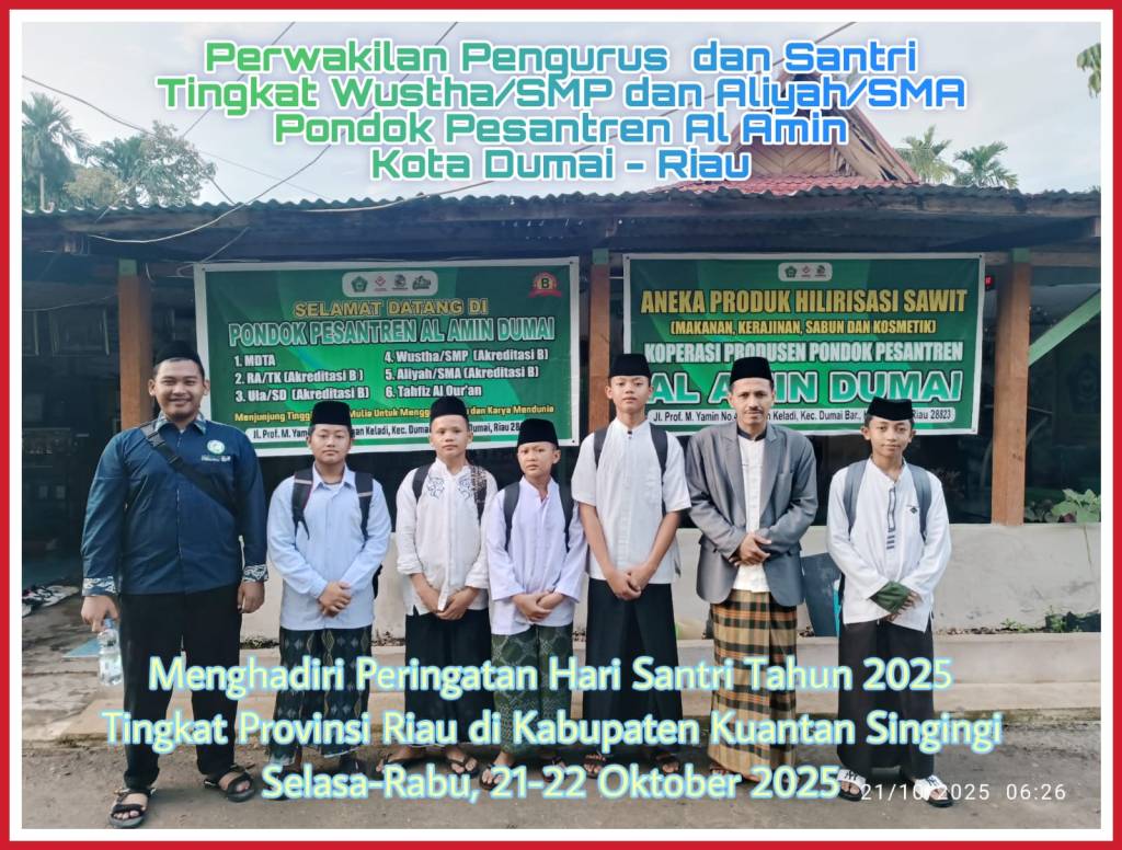 Dumai, Selasa, 21 Oktober 2025 – Pelepasan Pemberangkatan Santri FKPP Dumai Menuju Hari Santri Nasional Tingkat Provinsi Riau di Kabupaten Kuansing Bersama *Wakil Wali Kota Dumai Bapak H. Sugiyarto_ ( Perwakilan Pengurus, Santri Wustha/SMP dan Aliyah/SMA Pondok Pesantren Al Amin Dumai) Selasa Pagi, 21 Oktober 2025 di Halaman Masjid Dumai Islamic Center. Pimpinan Pondok Pesantren Al Amin Dumai hadir di event istimewa tahunan tersebut diwakili oleh Wakil Pimpinan Al Ustadz Arifat Nukman Hakim.