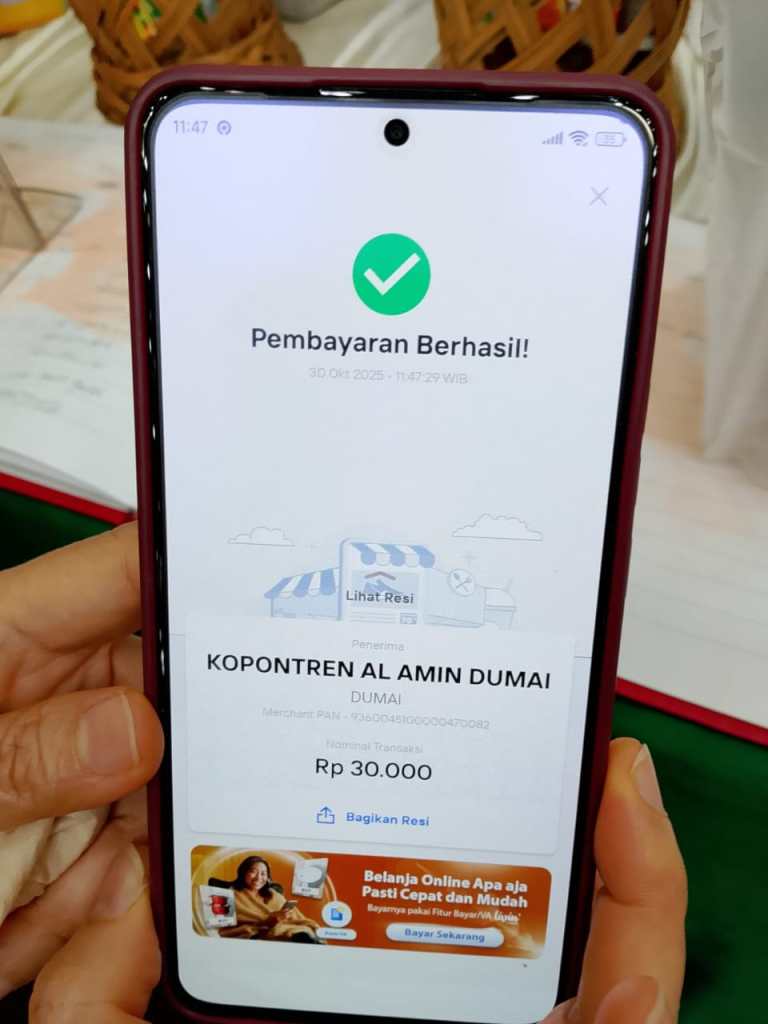 Pekanbaru, Santripreneur Indonesia – Selama kegiatan EXPO Kemandirian Pesantren Sempena Hari Santri 2025 di UIN Suska Riau pada Rabu-Kamis, 29-30 Oktober 2025 yang berlangsung di Pusat Kegiatan Mahasiswa ( PKM ), Koperasi Produsen Pondok Pesantren Al Amin Kota Dumai di UIN Suska Riau memaksimalkan transaksi dengan QRIS. Koperasi Al Amin Dumai sangat mendukung upaya peningkatan transaksi non tunai. Hal ini sebagai langkah strategis menuju sistem pembayaran yang lebih efisien.